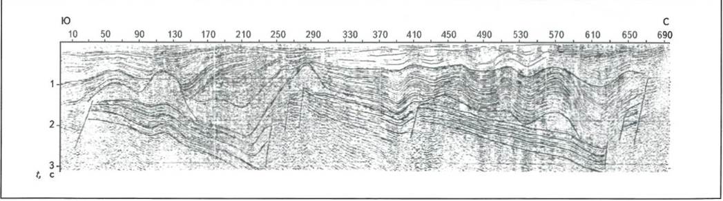 Наличие конседиментационных соляных куполов подтверждается фактическими материалами по целому ряду хорошо изученных нефтегазоносных районов. В Припятском прогибе, например, широко распространены две верхнедевонские (франская и фаменская) соленосные толщи, разделенные межсолевыми задонско-елецкими карбонатными отложениями на севере и терригенными - на юге. Высокая степень геолого-геофизической изученности прогиба позволила выявить особенности строения и время формирования куполов. На опорно-параметрическом сейсмическом профиле (рис. 1) [4], в интервале пикетов 410-690 (северная часть прогиба), хорошо видны постседиментационные соляные купола в фаменской соленосной толще. Мощные (> 1500 м) осадочные отложения, перекрывающие галитовую толщу, смяты в конформные складки, повторяющие общую конфигурацию соляных куполов, возникшую в процессе галокинеза. Мезо-кайнозойские отложения, сформировавшиеся после галокинеза, на формы соляных куполов не реагируют.
