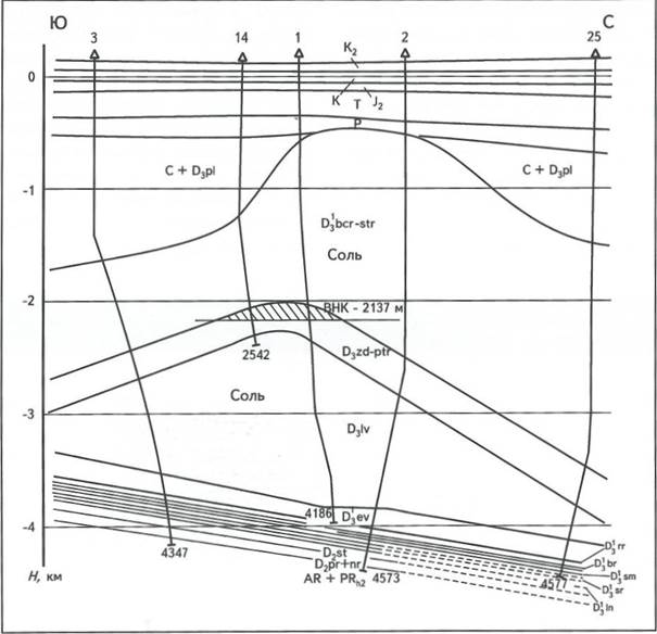 Рис. 2. ГЕОЛОГИЧЕСКИЙ ПРОФИЛЬ ЧЕРЕЗ ОСТАШКОВИЧСКОЕ И ЮЖНО-ОСТАШКОВИЧСКОЕ НЕФТЯНЫЕ МЕСТОРОЖДЕНИЯ (ПРИПЯТСКИЙ ПРОГИБ) (Грибик Я.Г., Микуикий С.П., Свидерский Э.И., 1997)