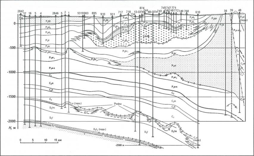Рис. 5. ГЕОЛОГИЧЕСКИЙ РАЗРЕЗ СОЛИКАМСКОЙ ВПАДИНЫ (Кудряшов А.И., 2001)