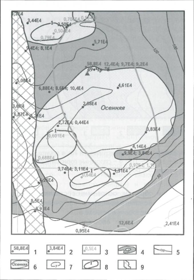 Концентрация Rn, Бк/м3: 1-> 105, 2- 104-105, 3-< 104; 4- массив аномалий Rn; 5- сплошные горизонтали; 6- структуры, подготовленные сейсморазведкой; аномалии с концентрацией Rn, Бк/м3: 7- 104-105, 8-< 104; 9- разуплотнение пород геологического разреза, обусловленное разрывными нарушениями