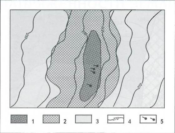 Содержание объемной активности Rn в грунте, Бк/м3: 1 - 10е, 2- 105, 3- 104; 4 - сплошные горизонтали (проведены через 20 м); 5 - родники