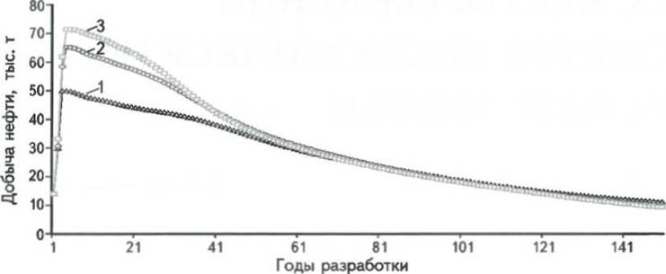Рис. 1. ДИНАМИКА ДОБЫЧИ НЕФТИ С РАЗЛИЧНЫМИ ГЕОЛОГО-ГИДРОГЕОЛОГИЧЕСКИМИ УСЛОВИЯМИ