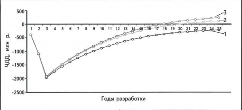 На основании экономических расчетов наилучшими значениями ЧДД характеризуется вариант с высокой проницаемостью коллекторов, значительной законтурной областью и высокой вязкостью пластовой воды (рис. 2).